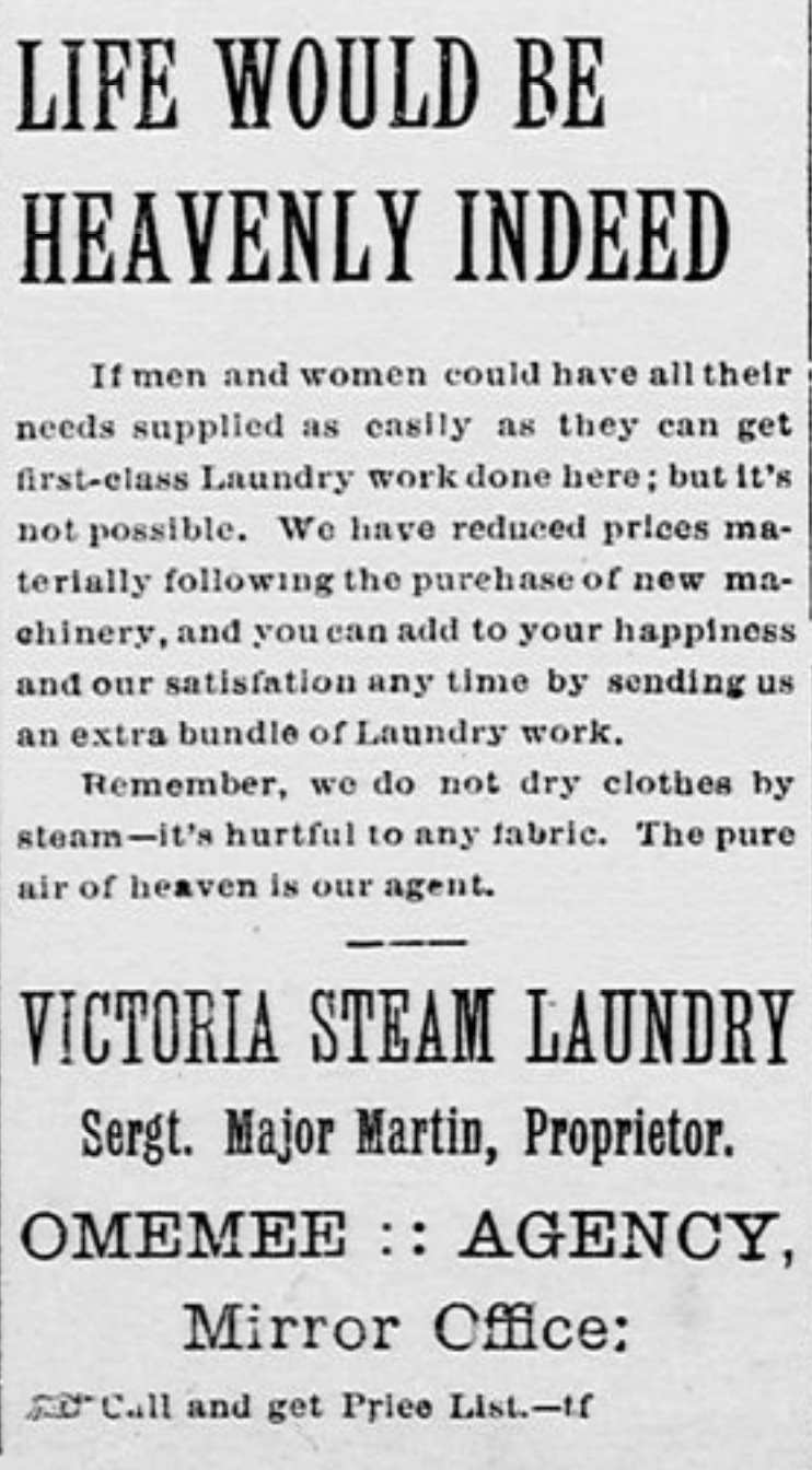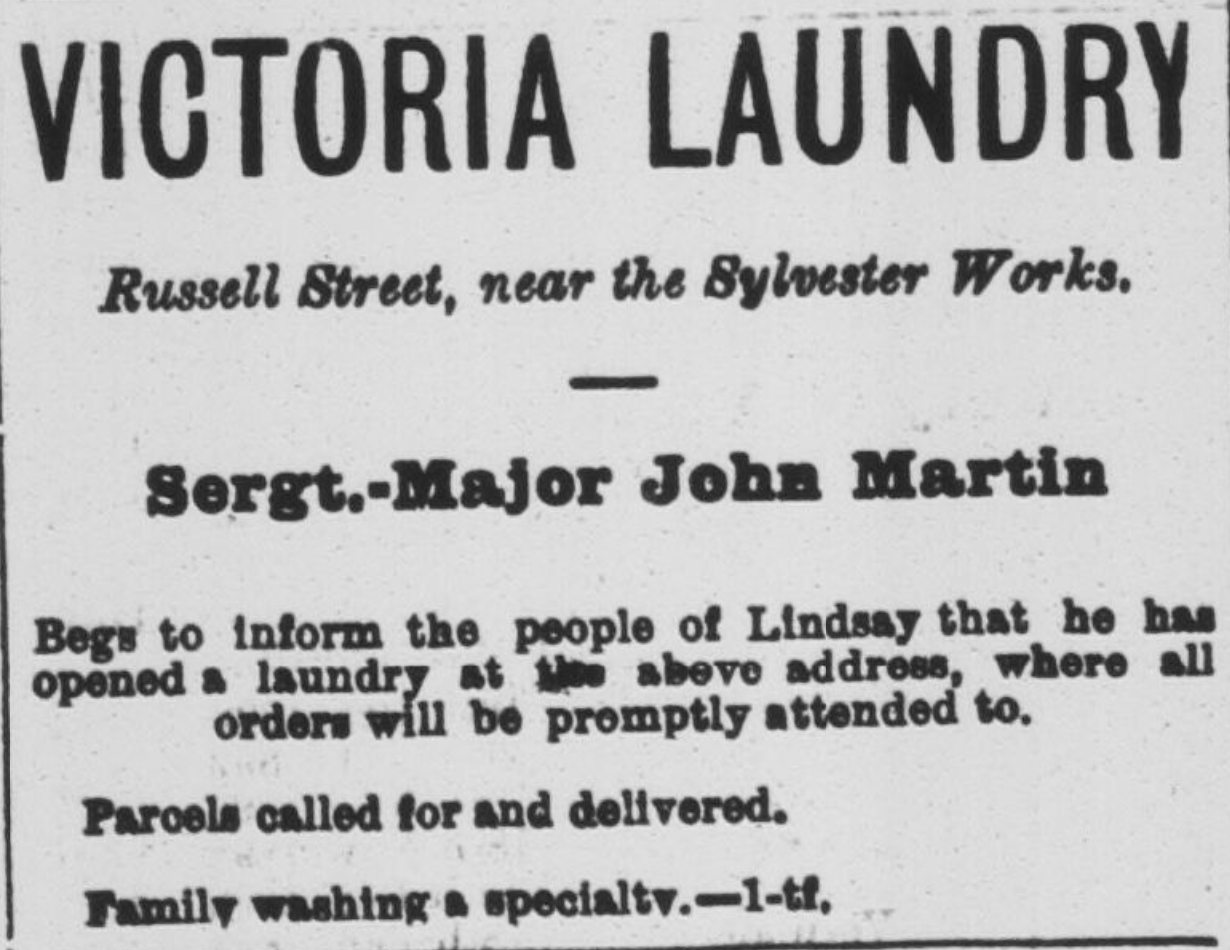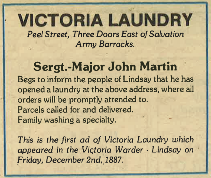 Business did so well, Sgt-Maj Martin opened another location in Omemee. This advertisement also shows one of the many names used by the business over its lifetime: “Victoria Laundry”, “Victoria Steam Laundry”, “Victoria Electric Laundry” and “Victoria Laundry and Dry Cleaning.”