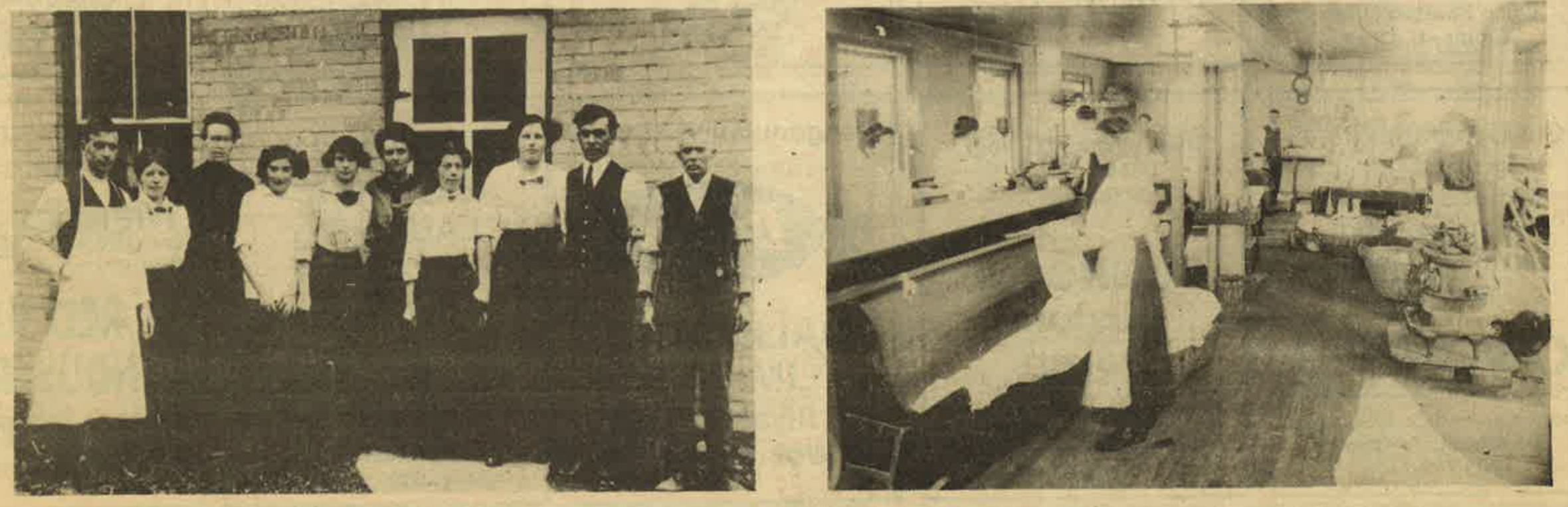 The fire started at 2pm on November 6 with a spark on the pitch and tar roof of the laundry, which was in the frame building attached at the rear of the brick house, over the boiler and sorting rooms. The fire quickly spread over the entire building as firefighters contended with a westerly breeze fanning the flames. A laundry truck parked nearby exploded. Some of the clothing in for washing was destroyed, but miraculously, all dress shirts had been saved, thanks to the employees and citizens for quickly carrying the laundry out of the building.